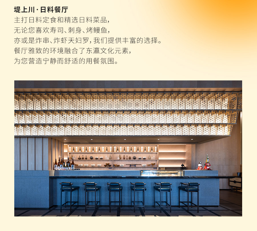 堤上川·日料餐厅:11:30-14:00,17:30-21:00;望津里老运河餐厅/盛庭中餐厅营业时间:11:30-13:30,17:30-20:00;