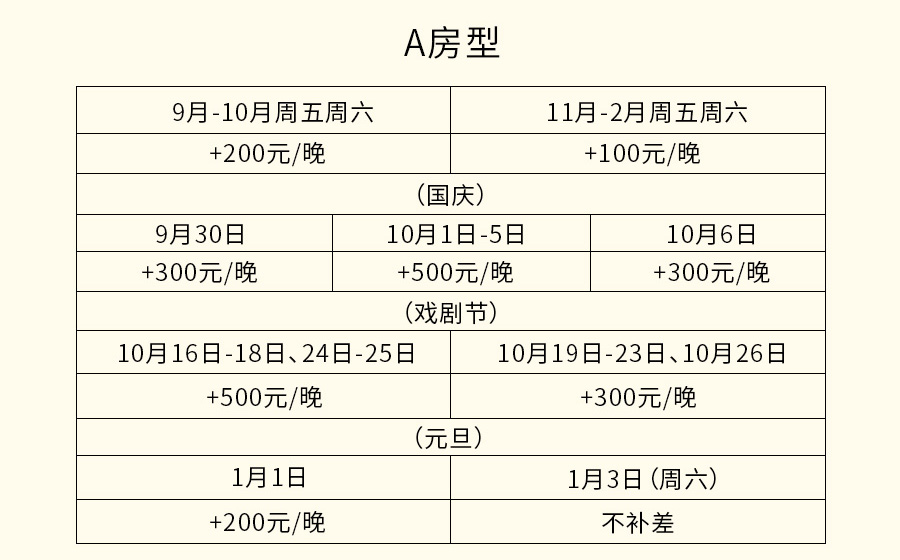 a房型:11月-2月周五周六补差100元/晚;元旦1.1补差200元/晚,1.3(周六)不补差。