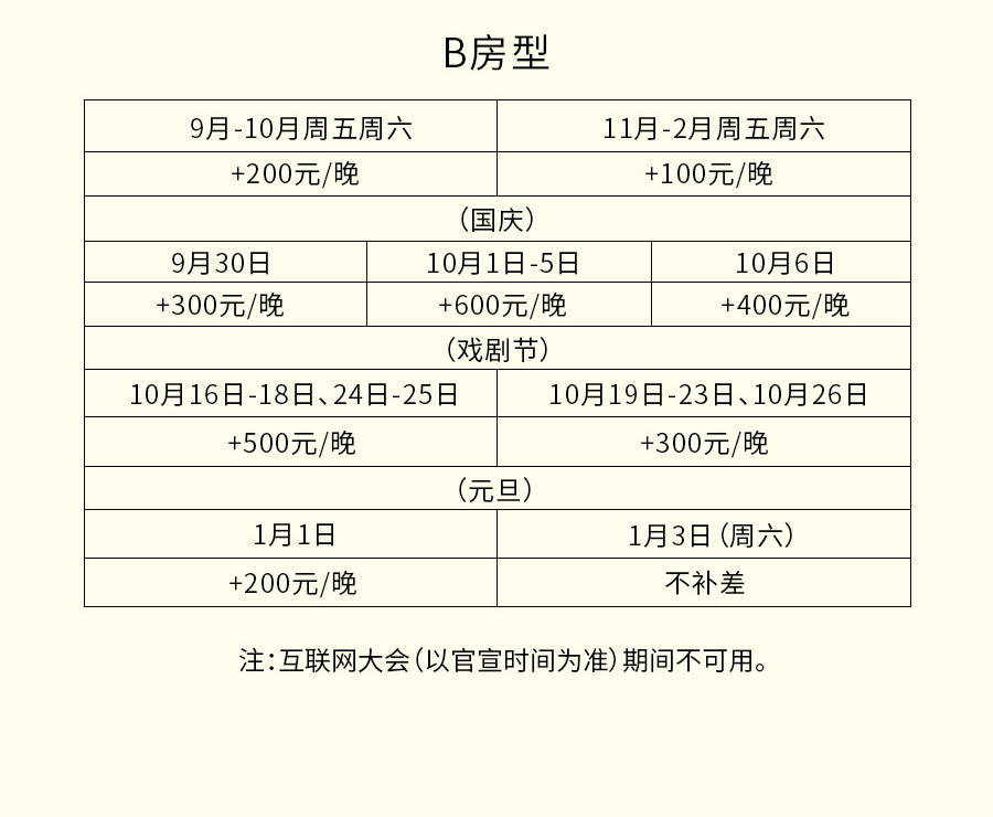 b房型:11月-2月周五周六补差100元/晚;元旦1.1补差200元/晚,1.3(周六)不补差。