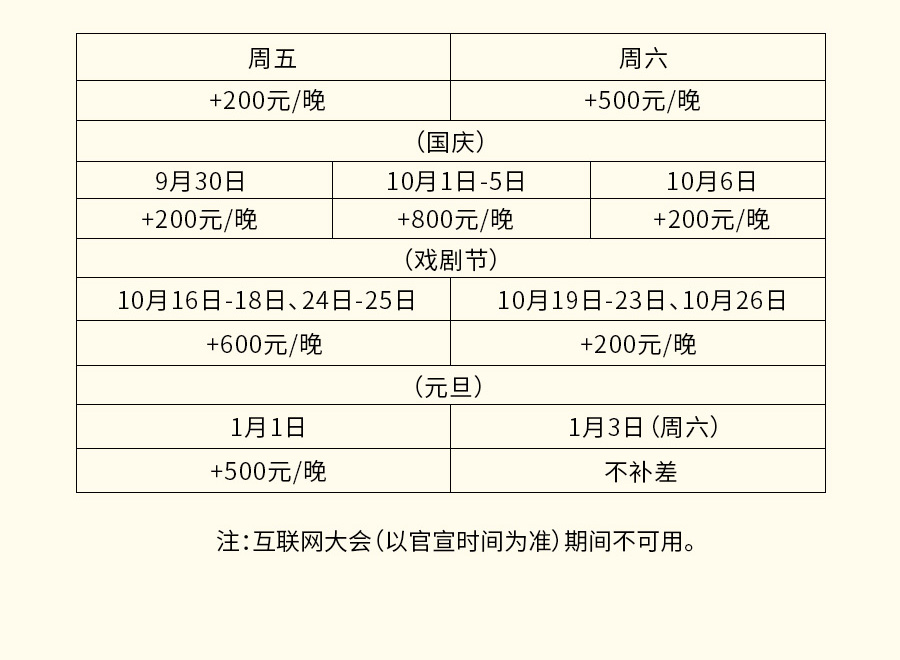 补差政策:周五补差200元/晚,周六补差500元/晚;