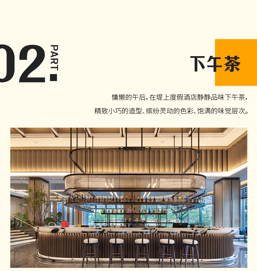 下午茶体验时间:13:00-21:00,体验地点:堤上大堂吧;