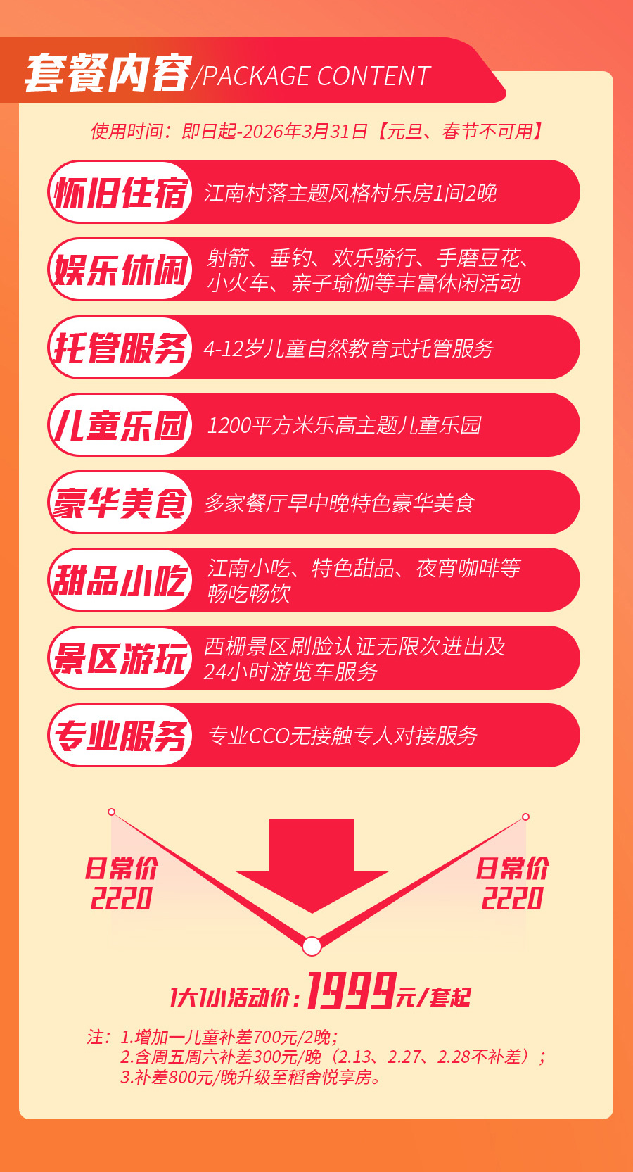 增加一儿童补差700元/套(两晚);含周五周六补300元/晚;其中2月13日、2月27日、2月28日不补差;补差800元/晚升级至稻舍悦享房;