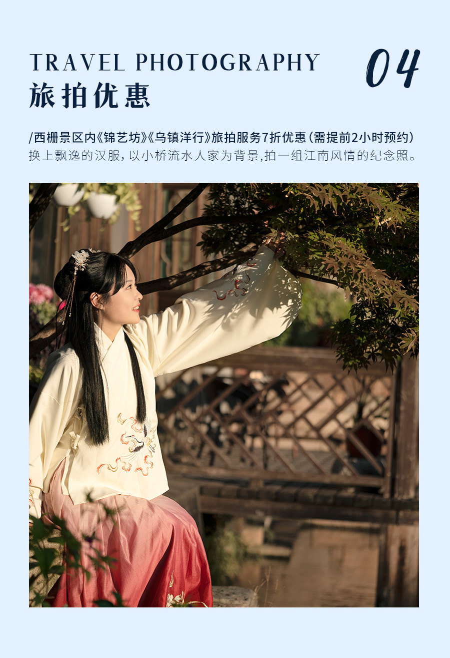 旅拍需提前2小时预约:《锦艺坊》预约电话:15167352260或13857300474(预约时间:09:00-21:00),《乌镇洋行》预约电话: 0573-88029257(预约时间:09:00-21:00);