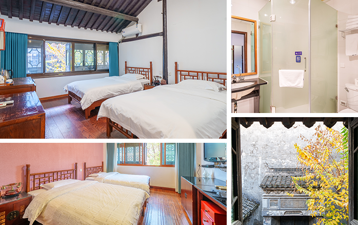 房间内设2张1.2米单人床,窗外街景或庭院景